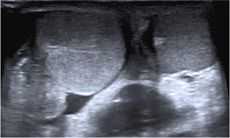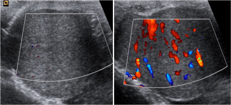 Teste derecho muy aumentado de tamaño, hipoecogénico de forma difusa y con muy alta captación de señal Doppler color. El diagnóstico final fue infiltración difusa testicular por leucemia.