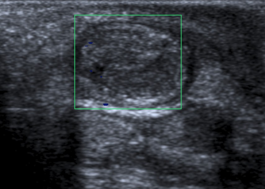 Pediatrico de 11 años con clínica de scroto agudo. Se observa flujo en el parénquima testicular, por tanto no hay torsión testicular. Sin embargo, observa una imagen nodular en el epidídimo que coincide con el punto doloros del paciente.
