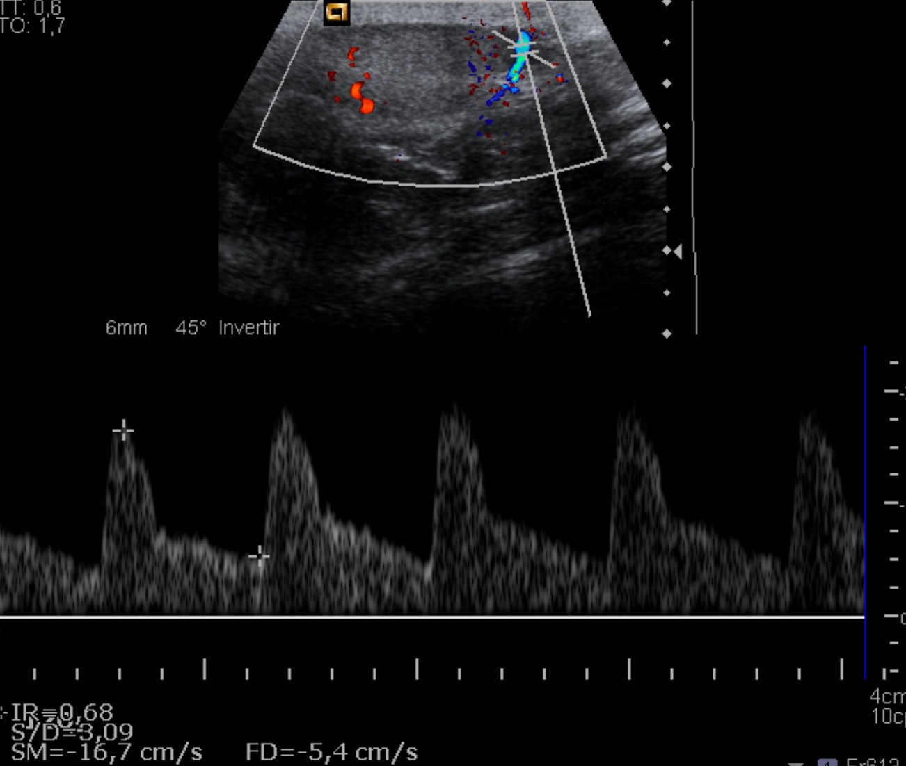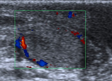 Doppler color: el flujo está aumentado en ambos, epidídimo y testículo, con respecto al lado contralateral. Esta hiperemia presenta un patrón de flujo elevado de baja resistencia con flujo diastólico elevado. En la orquiepidimitis el IR suele ser inferior a 0,5 (en un individuo sano rara vez ocurre esto).