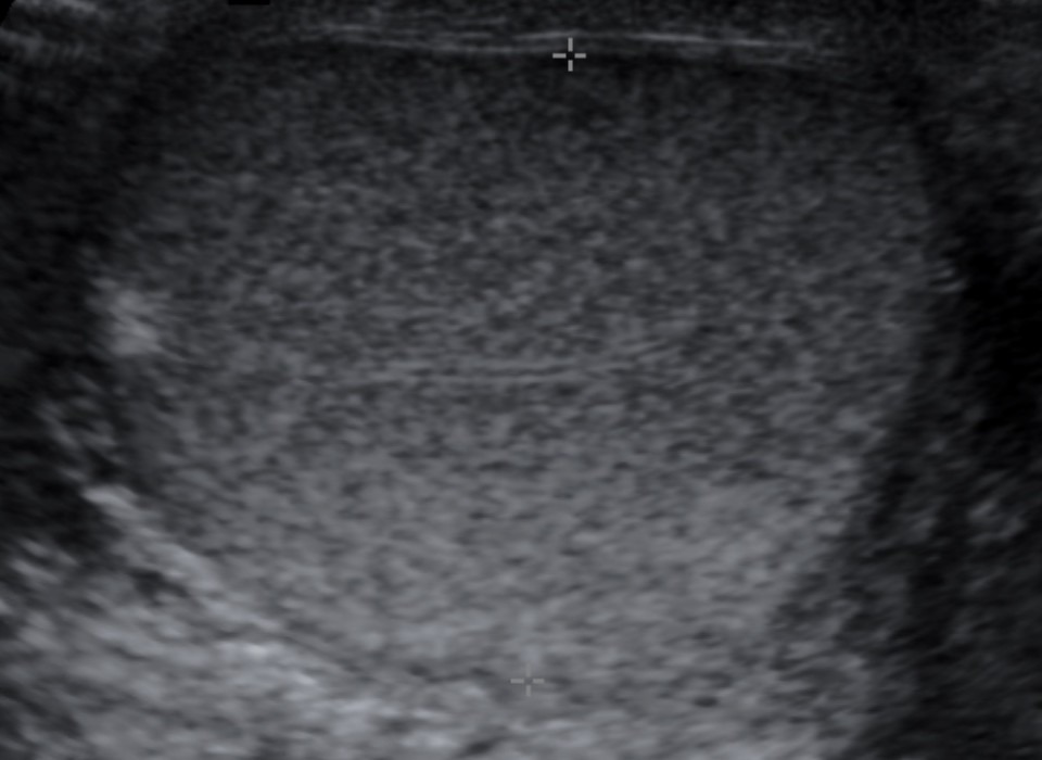 • Ecoestructura homogénea granular similar al tiroides. Los septos testiculares se visualizan como líneas hipoecogénicas y el mediastino como una línea hiperecogénica