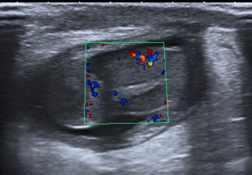 Testículo mal definido e irregular con zonas que no muestras captación de Doppler color.