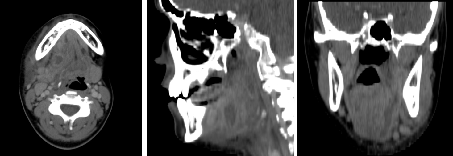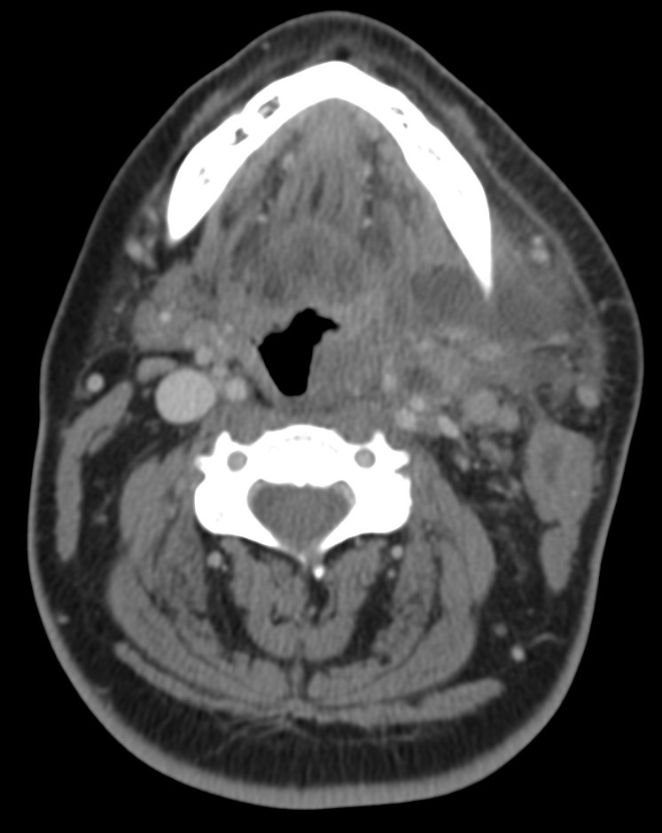 No es un absceso, es una celulitis multiespacial ya que afecta al suelo de la boca y los espacios sublingual y submandibular. Se manifiesta clínicamente por dolor, hinchazón, disfagia, fiebre y elevación de la lengua, puede asociar crepitación si se deben a microrganismos anaerobios. En la TC con contraste se observa: