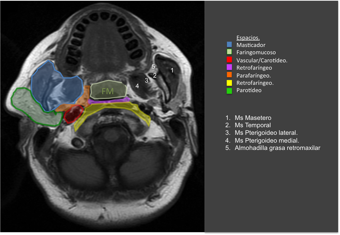 En este espacio encontraremos los músculos de la masticación y el hueso de la mandíbula con las piezas dentarias. Por tanto, en esta localización encontraremos infecciones de origen dentario que cursan con aumento de volumen, dolor, calor y rubor facial y que pueden acompañarse de disfagia y disfonía. Cuando se originan en el 2º y 3º molar pueden extenderse al espacio submandibular mientras que los que se presentan en los dientes más anteriores tienden a difundir al espacio sublingual.