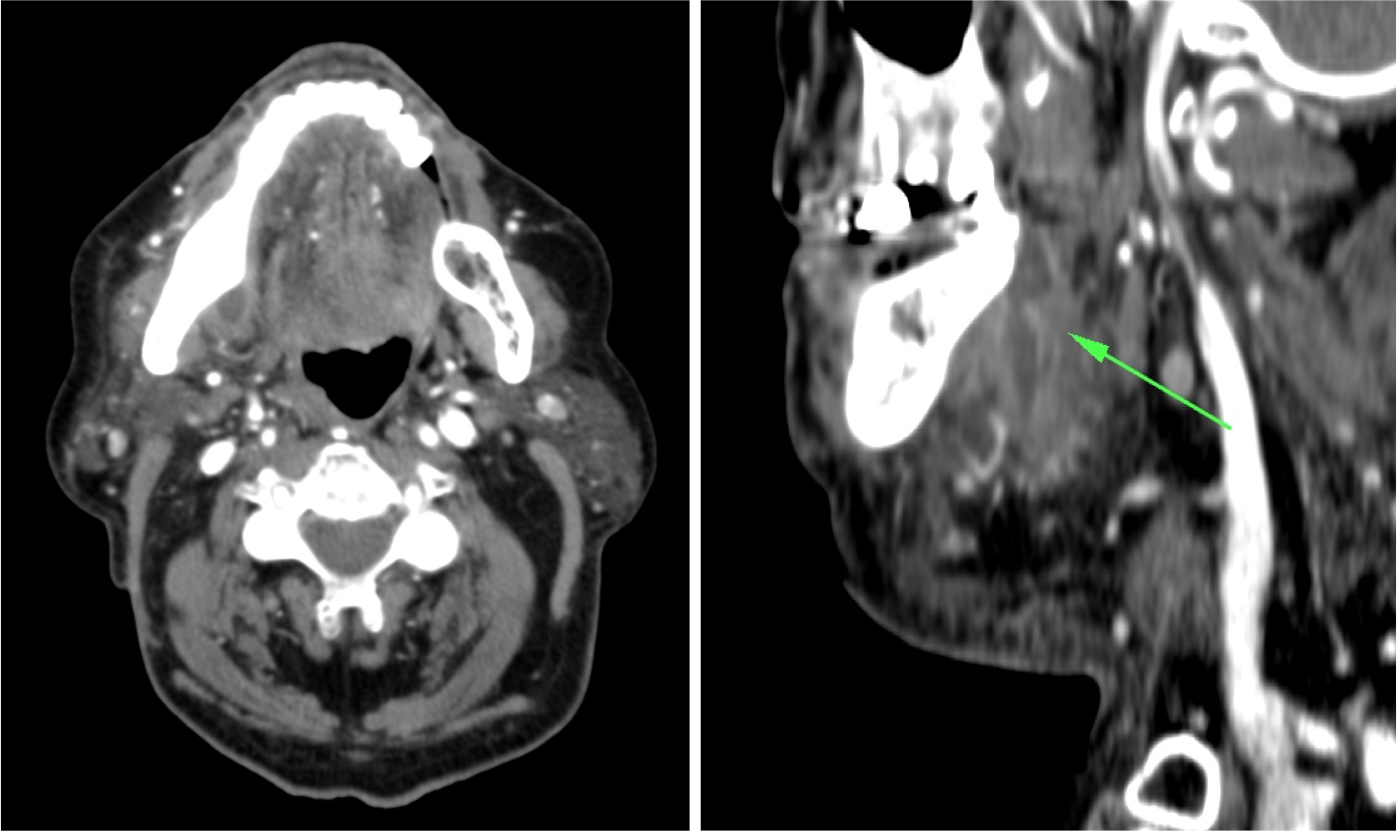 - Aumento de partes blandas y afectación de la grasa adyacente a los músculos de la masticación (celulitis y miositis).