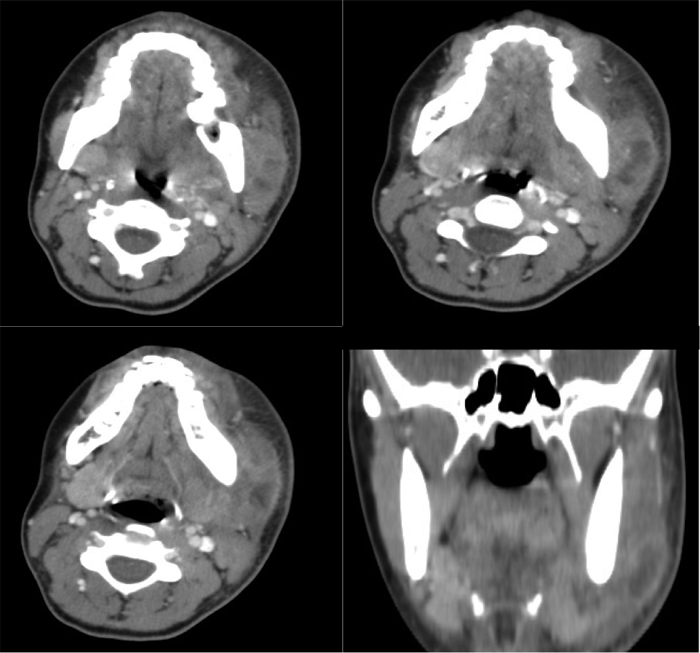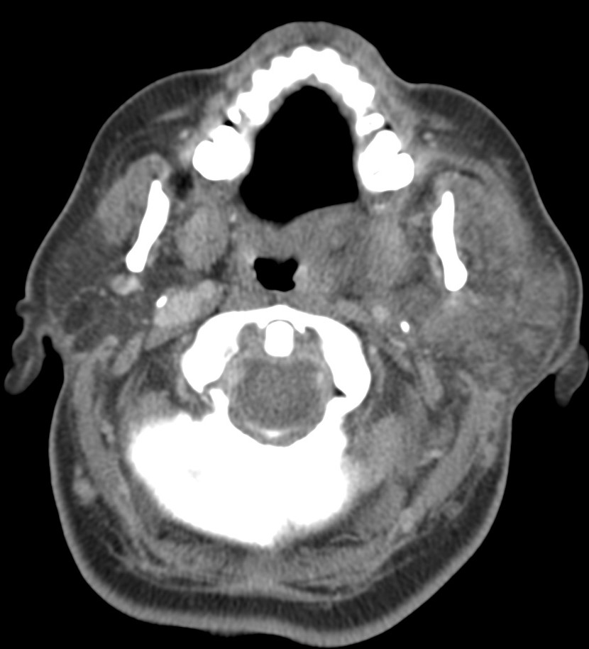 Pueden localizarse en el espacio submandibular. Pueden pasar desapercibidos hasta que se infectan. Localización característica: colecciones que pueden tener realce en anillo en situación anterior y profundo al esternocleidomastoideos