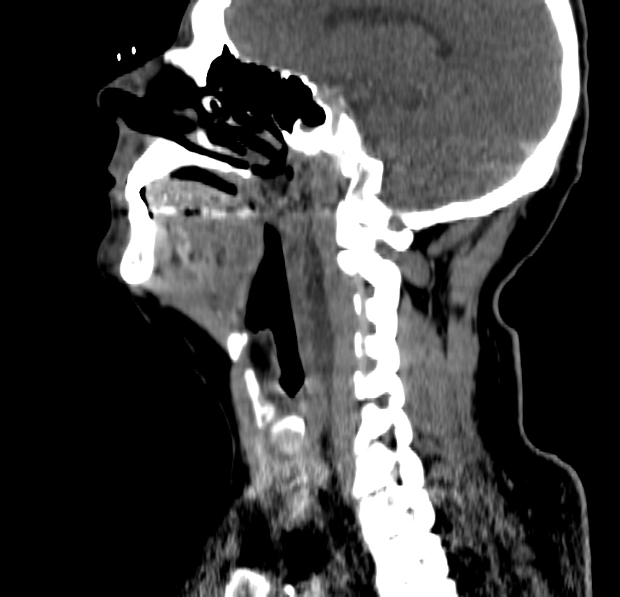 - Colección líquida con realce periférico en anillo, que ocupa y expande la retrofaringe, con o sin gas.