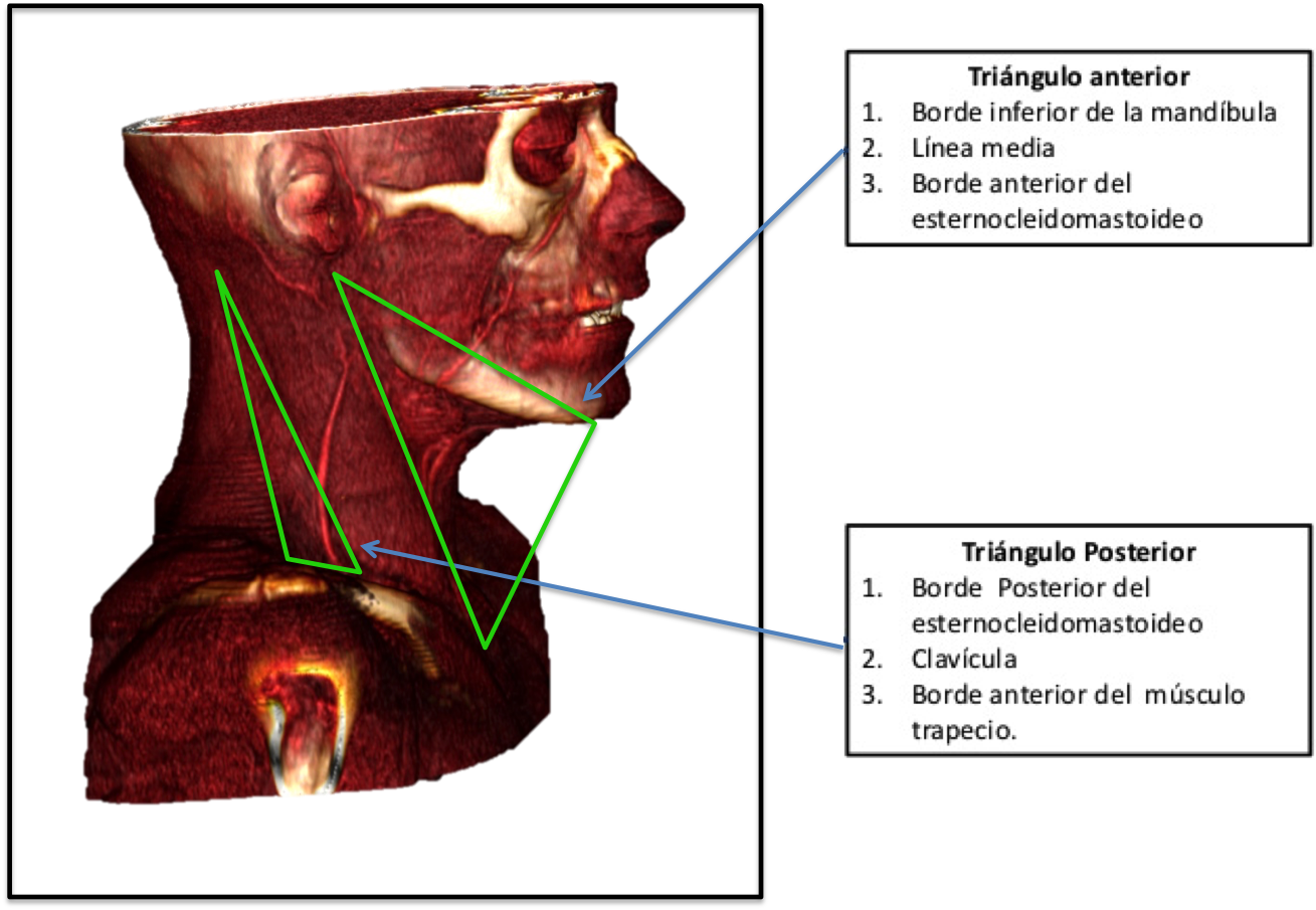 Es esencial conocer la anatomía y relaciones de los espacios cervicales y las fascias. En cuanto a la antomía superfiical, el cuello se puede dividir en: