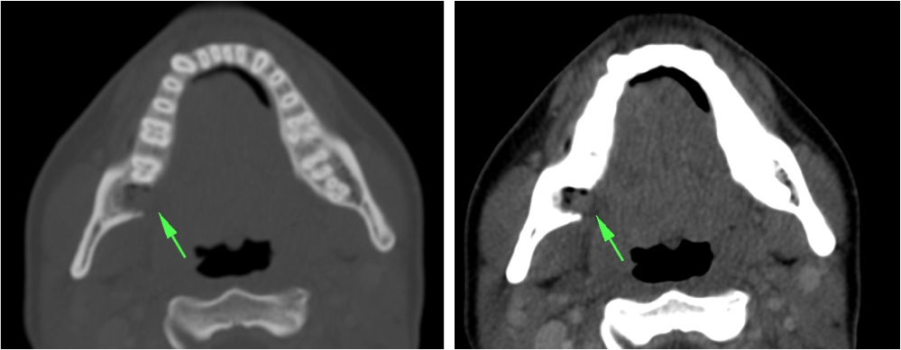 Puede ser identificada mediante TC por el estudio de las racies dentales, las cuales presentarán una lucencia o baja densidad que las rodea = signo de las raíces flotantes = afectación endodental = caries bacteriana que pogresa, afecta la pulpa y finalmente dañan la raíz del diente y el hueso de alrededor produciendo una osteomielitis localizada y abscesos subperiósticos o colecciones que se desplazan a tejidos superficiales.