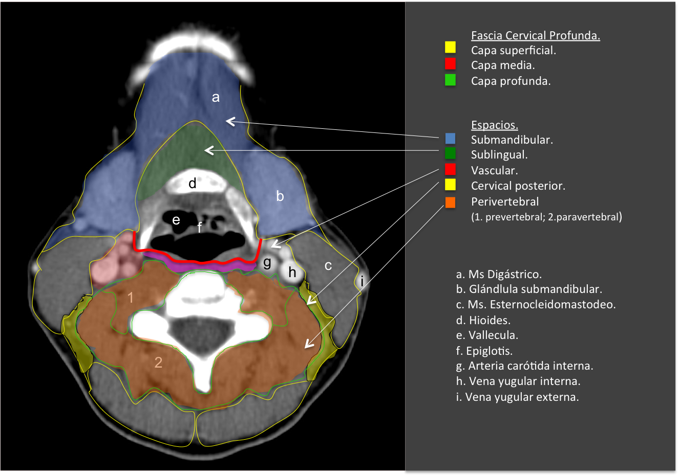 – Cuello infrahioideo, por debajo del hueso hiodes. Algunos de estos espacios se continúan hacia arriba (suprahioideo) y/o hacia el mediastino, incluye los espacios: visceral, cervical posterior, vascular, retrofaríngeo y perivertebral.