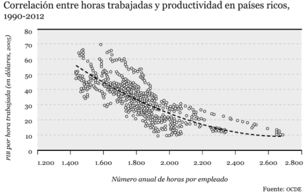 Es decir, que la mayor productividad se alcanza con jornadas laborales de 6 horas. Nunca he entendido que me regañen por no estar a las 8.15 h en el hospital cuando lo primero que se hace ir a la cafetería, por no contar las visitas a la máquina de bebidas (amparo sindical mediante). Además, para esto que comento, hacer más horas en el trabajo sirve para otras cosa: para morirse de manera prematura.