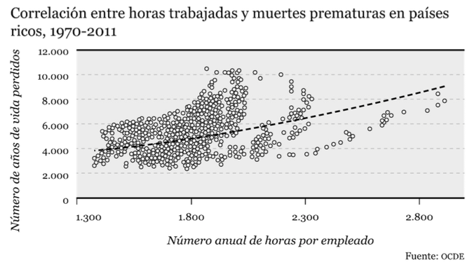 Es decir, que la mayor productividad se alcanza con jornadas laborales de 6 horas. Nunca he entendido que me regañen por no estar a las 8.15 h en el hospital cuando lo primero que se hace ir a la cafetería, por no contar las visitas a la máquina de bebidas (amparo sindical mediante). Además, para esto que comento, hacer más horas en el trabajo sirve para otras cosa: para morirse de manera prematura.